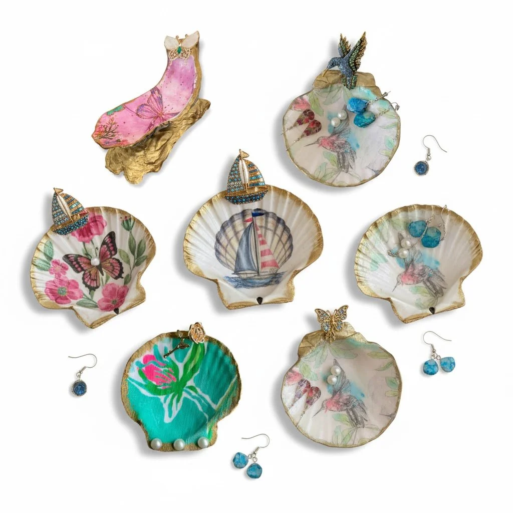 There you will find crafts functional art from nature and vintage treasures. Our UV-protected shell dishes, hand-gathered from the Chesapeake Bay and New England’s Atlantic, feature vibrant hummingbird or floral designs, sealed for durability as jewelry trays. Our three-tiered vintage china cake stands, made from patterns like Royal Albert “Old Country Roses,” add elegant charm to gatherings. Our alcohol ink-infused glass bulbs offer a modern, colorful flair. Each unique piece blends Eclectic Revival and Resilient Luxury, reviving shells and china with expert craftsmanship.