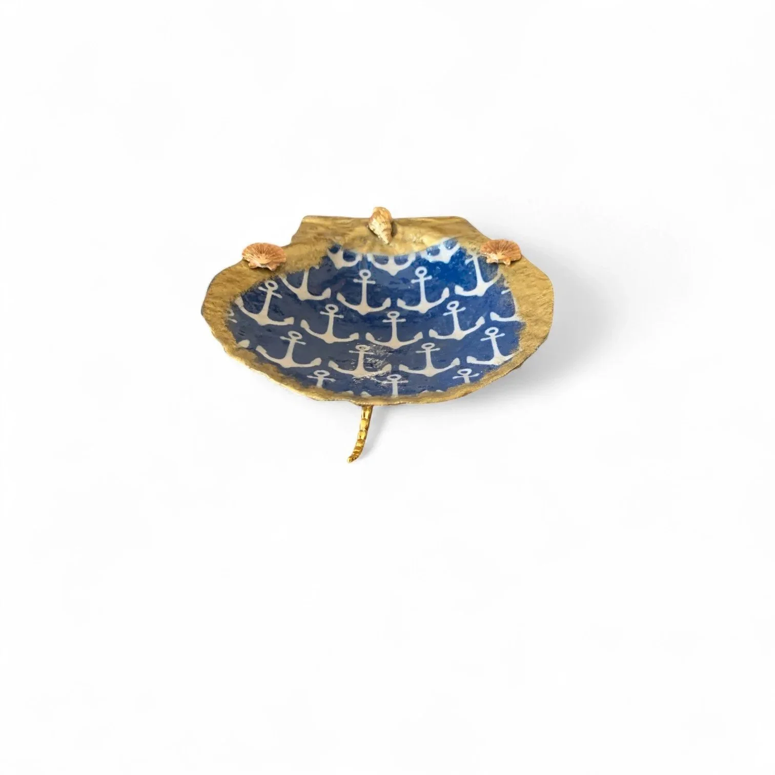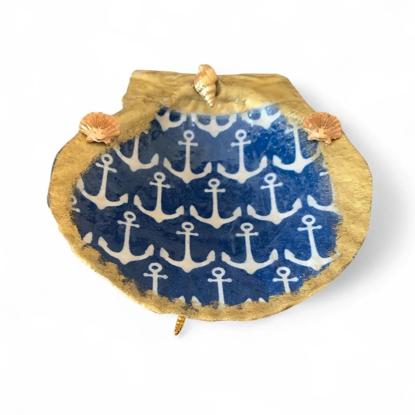 A serene great blue heron wades through watercolor reeds on this UV-sealed scallop shell, decoupaged with soft coastal artistry. A single freshwater pearl crowns the scene, framed by gilded edges for quiet elegance. Ideal for jewelry, soaps, or bayside serenity.